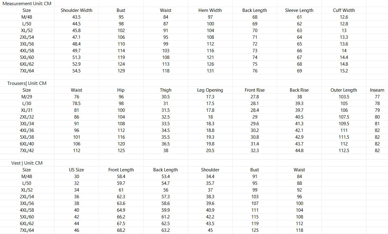 Includes: Jacket; Pants; Vest